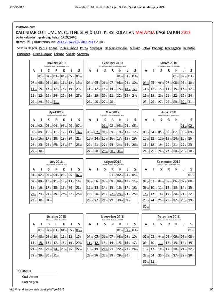 Kalendar Cuti Umum Cuti Negeri Cuti Persekolahan Malaysia 2018 Pdf